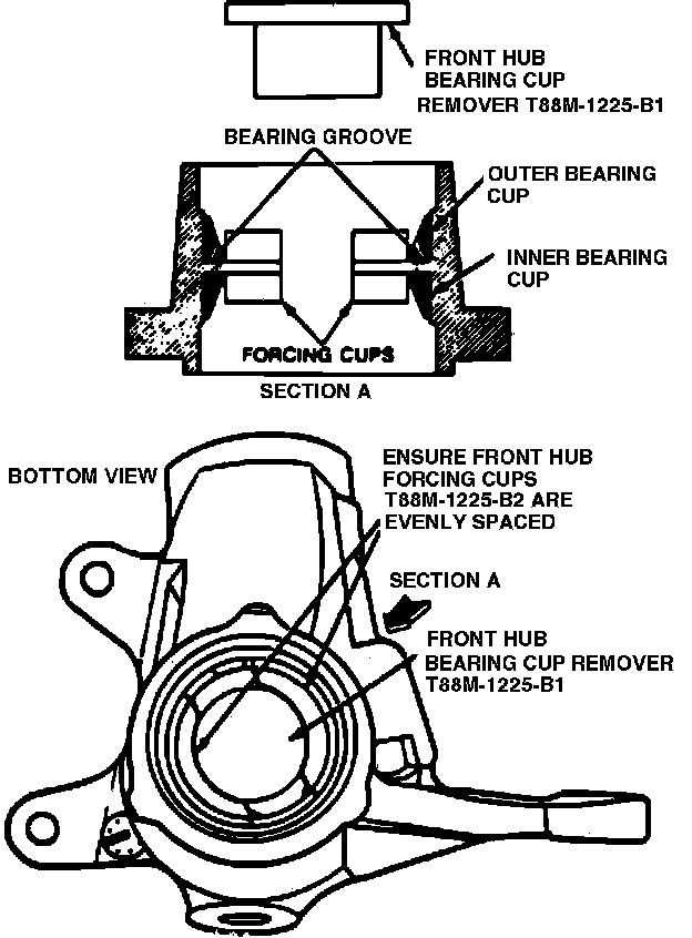 a. Install bearing cups using tool No. T88M-1225-C or equivalent with carrier supported by a block of wood.