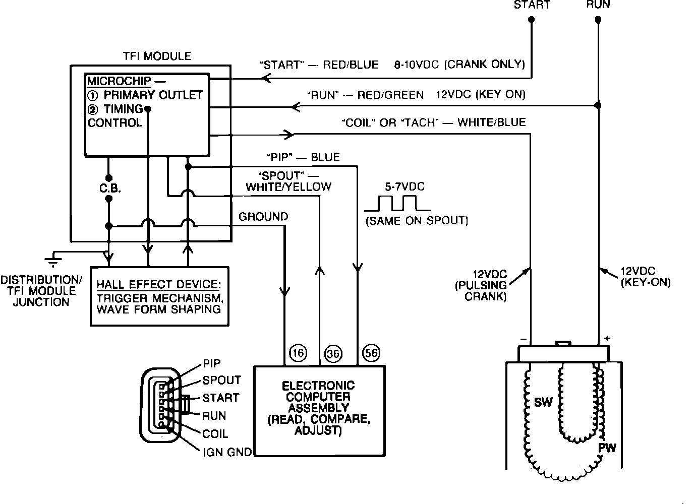 The TFI IV module supplies the spark to the distributor through the ignition coil and calculates the duration. It receives its control signal from the ECA (SPOUT).