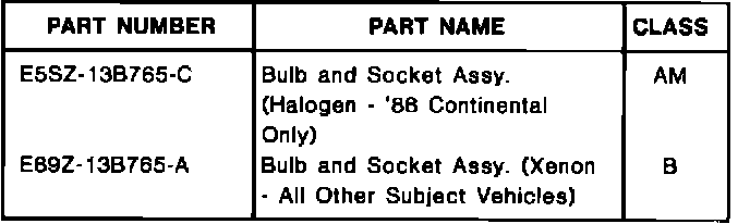 NOTE: THE ORANGE BASE HALOGEN BULB AND SOCKET ASSEMBLY (E5SZ-13B765-C) IS THE ONLY BULB THAT IS SPECIFIED FOR USE IN THE 1988 CONTINENTAL. ALL OTHER VEHICLE APPLICATIONS SHOULD USE THE BLUE BASE XENON BULB (E89Z-13B765-A). DO NOT REPLACE STANDARD BULBS WITH HALOGEN OR XENON BULBS.