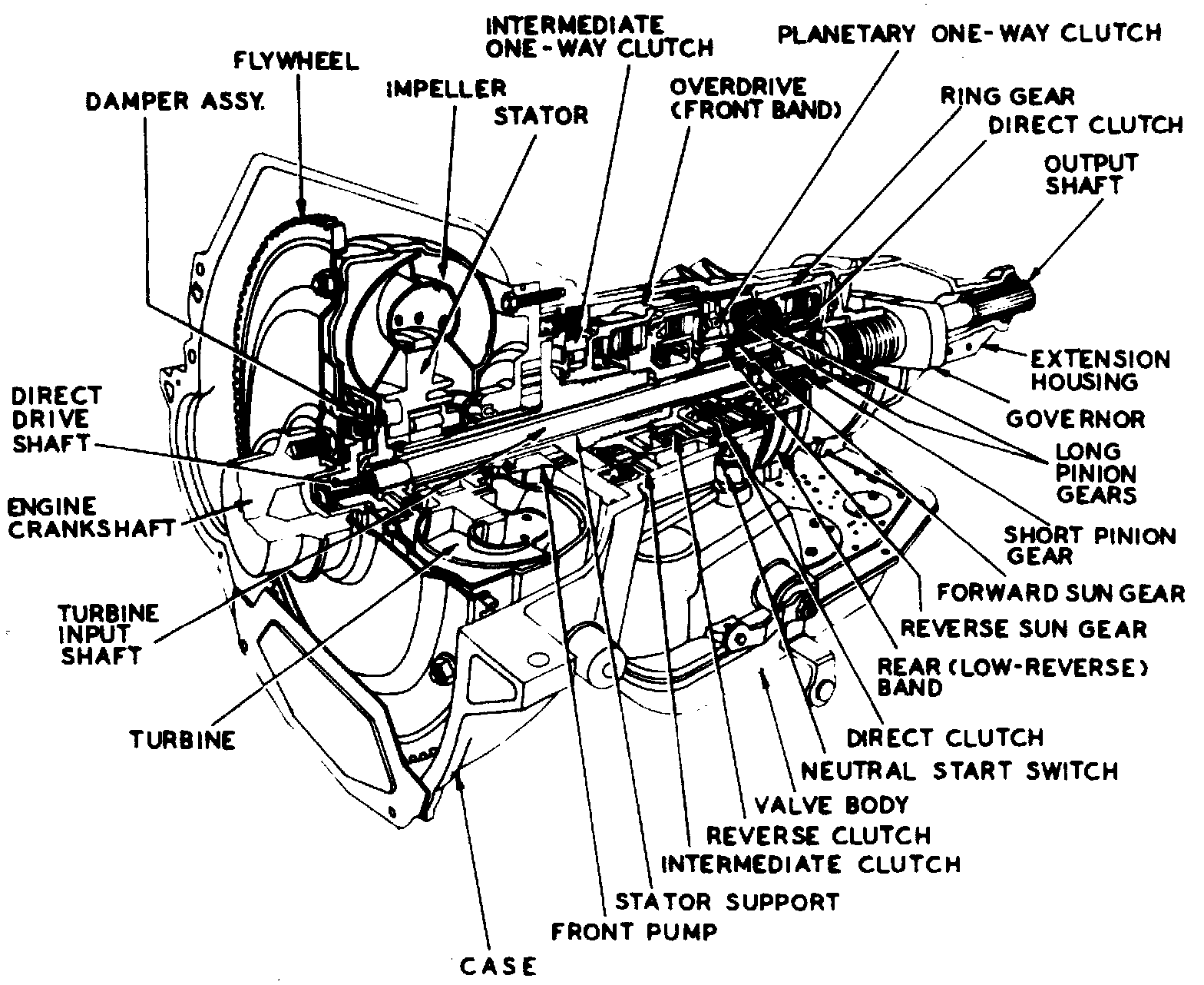 The transmission consists essentially of a torque converter assembly, compound planetary gear train, and a hydraulic control system. For gear control the transmission has four friction clutches, two one-way roller clutches, and two bands. Overdrive is accomplished by the addition of a band to lock the reverse sun gear while driving the planet carrier. The direct drive input shaft couples the engine directly to the direct clutch. This shaft is driven by the torque converter cover through the damper assembly which cushions engine shock to the transmission.
