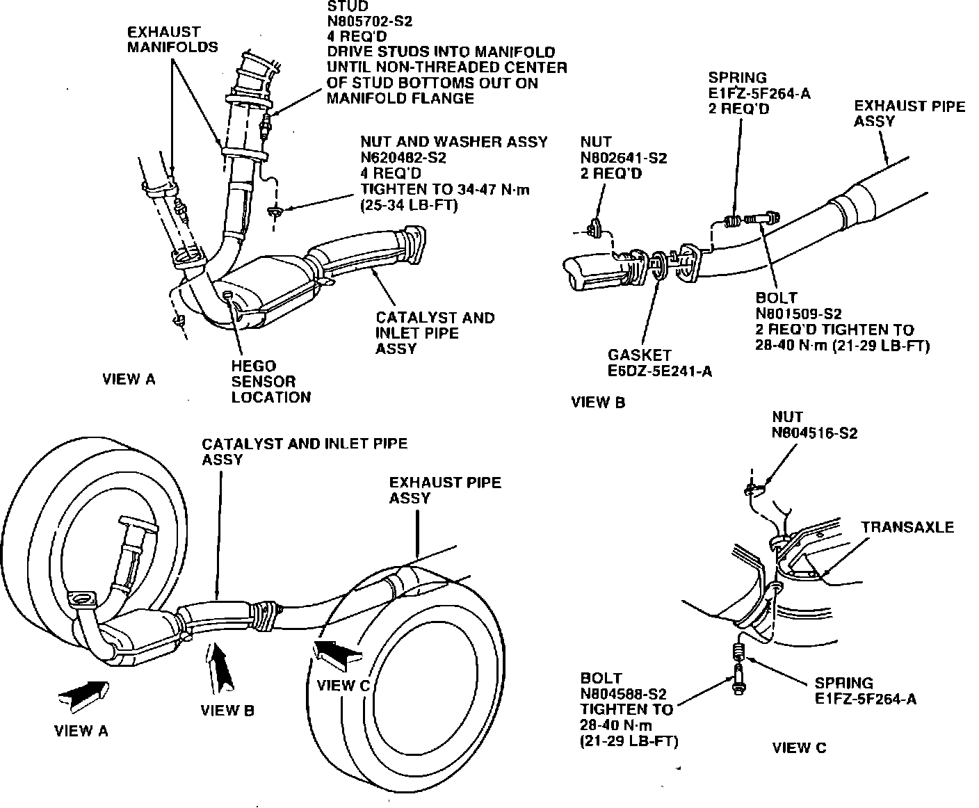 3. Remove front and rear catalytic converter flange fasteners and bolt and spring attachment at transaxle.