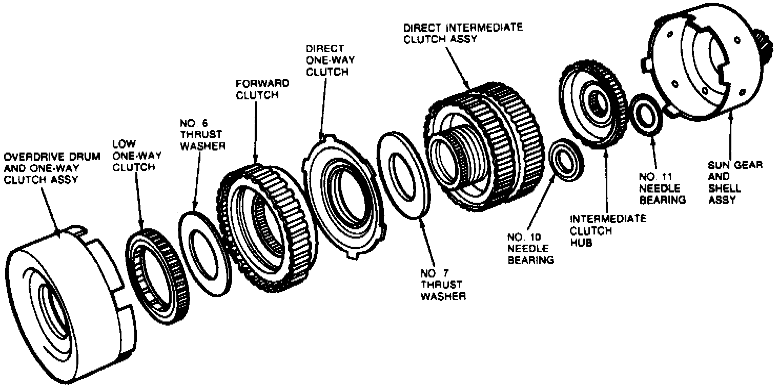 2. Remove No. 11 needle bearing, intermediate clutch hub, and No. 10 needle bearing.