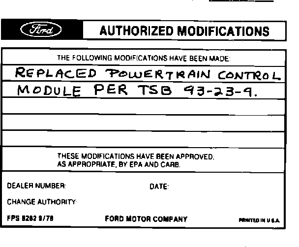 Obtain an Authorized Modifications Decal and list the date, dealer number, and summary of alterations performed. Select a prominent place adjacent to the Vehicle Emission Control Information Decal suitable for installing the Authorized Modifications Decal. Clean the area, install the decal, and cover it with a clear plastic decal shield.