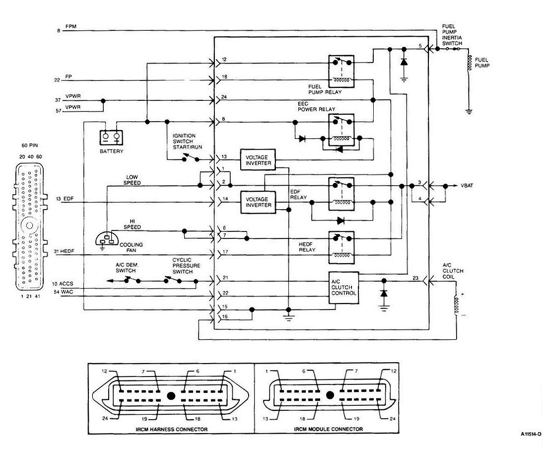 The Integral Relay Control Module (IRCM) interfaces with the EEC-IV processor to provide control of the cooling fan, A/C clutch, and the fuel pump.