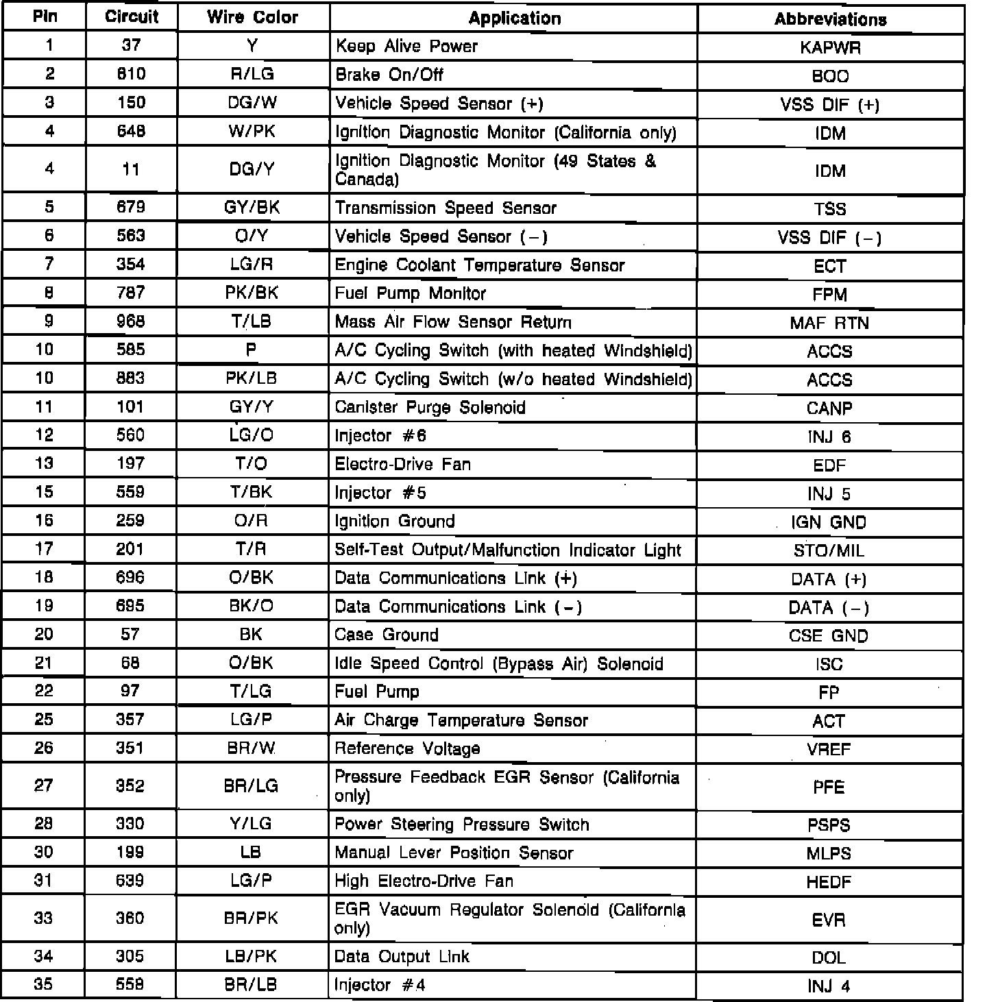 Electronic Control Assembly (ECA) Connector Pinout: