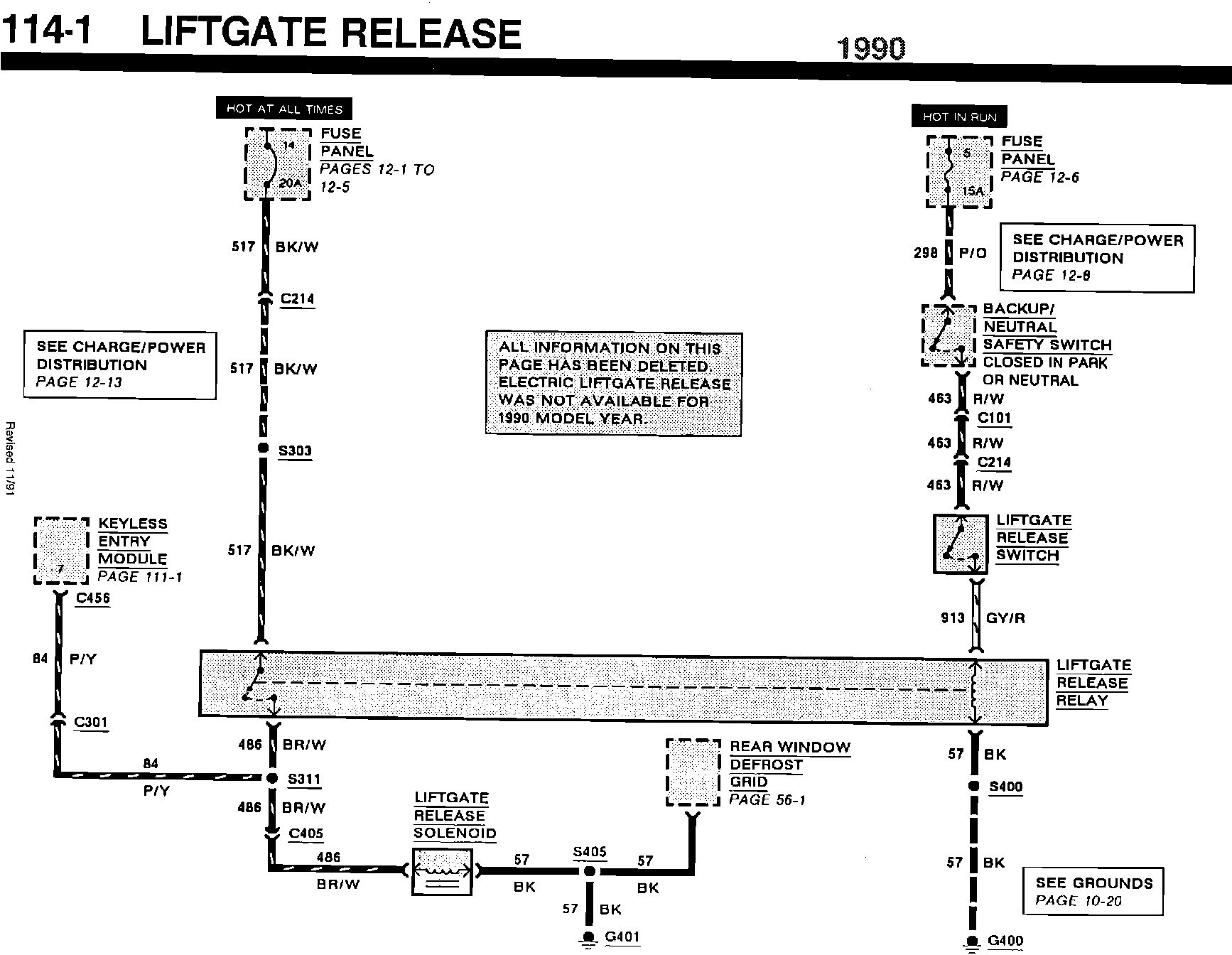ISSUE: References to the Remote Liftgate Release for 1990 and 1991 Taurus/Sable vehicles must be deleted, as this component was not available as an option in these vehicles. Pages 1-2, 114-1 and 114-2 of the 1990 Taurus/Sable EVTM and Page 1-2 of the 1991 Taurus/Sable EVTM are affected.