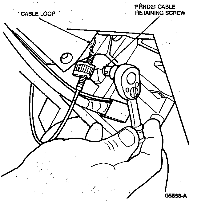 9. Attach PRND21 cable loop on shift selector hook, and install PRND21 cable bracket to actuator housing. Install retaining screw and tighten to 7-11 N.m (5-8 lb-ft) (column shift only).