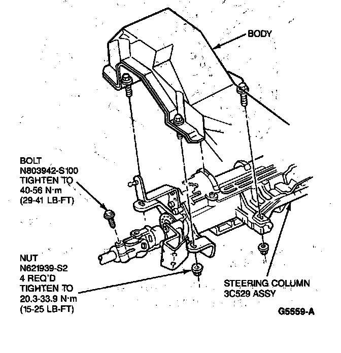3. Support column assembly to column support bracket. Install four retaining nuts and tighten to 13-19 N.m (10-14 lb-if).