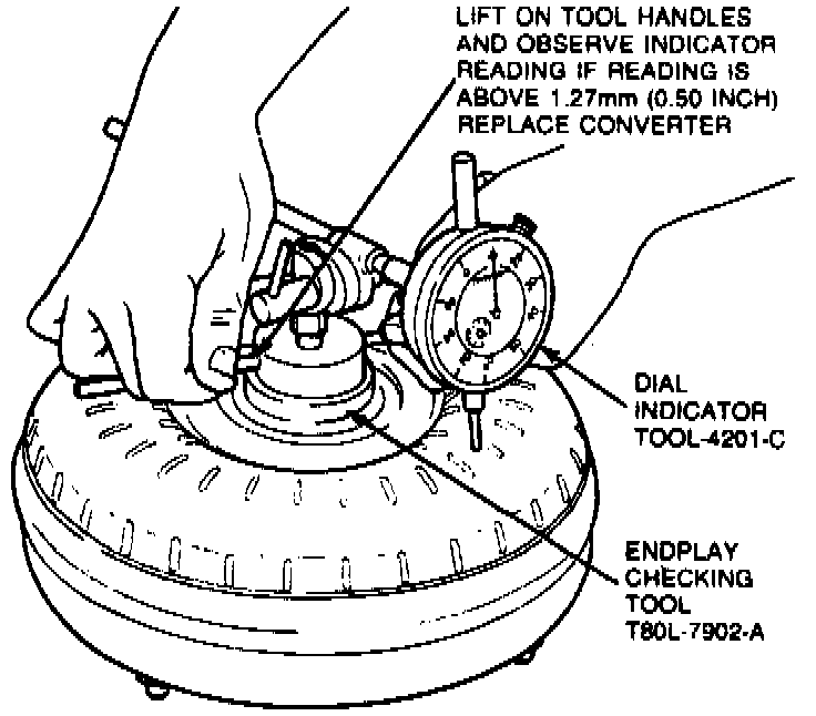 TORQUE CONVERTER ENDPLAY TEST1. Install endplay checking tool No. T80L-7902-A and guide sleeve No. T86P-7902-A or equivalent in torque converter hub.