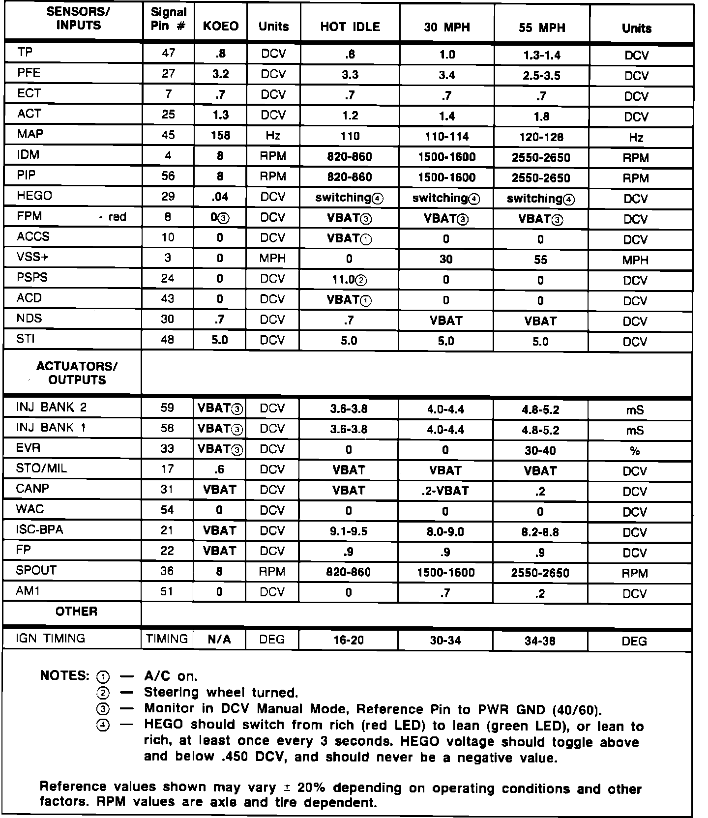5. Reference values shown in the charts may differ between vehicles due to component tolerances, driving conditions, weather, etc. These values were recorded at approximately 600 feet above sea level and ambient temperatures ranging from 50 to 70 degrees Fahrenheit. Some EEC-IV devices are temperature dependent and their values may vary greatly. Other values are calibration dependent and may also vary.