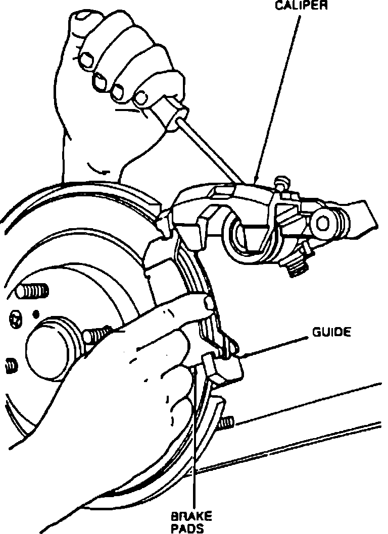 4. Using a screwdriver, pivot caliper on its mounting bracket to access brake pads as shown in Fig. 32. If upper lock bolt requires lubrication or service, remove and suspend caliper using wire or equivalent.