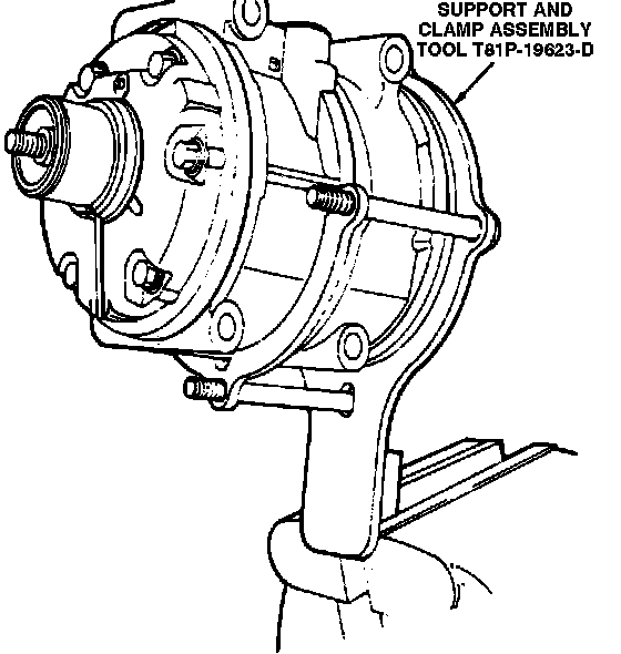 3. Install tool T81P-19623-D or equivalent on compressor to retain cylinder assembly and rear head in position, Fig. 8. Then clamp tool in a vise.