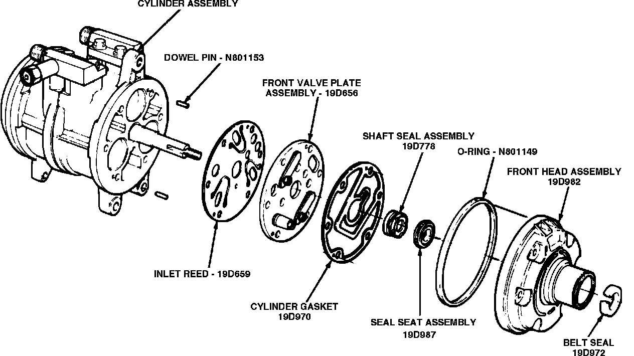 5. Remove six through bolts from compressor, then remove front head. Valve plate assembly, inlet reed, shaft seal and cylinder gasket will come off with head.