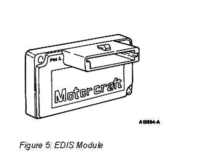 The EDIS Module is a microprocessor-based device with coil drivers which make decisions about spark timing and coil firing. The module turns the coils on and off at the correct time and in the proper sequence based on information from the VR sensor and a pulse-width modulated signal (SAW) generated from the EEC-IV processor. The module receives VRS and SAW signals and produces PIP and IDM output signals which are sent to the EEC-IV processor.