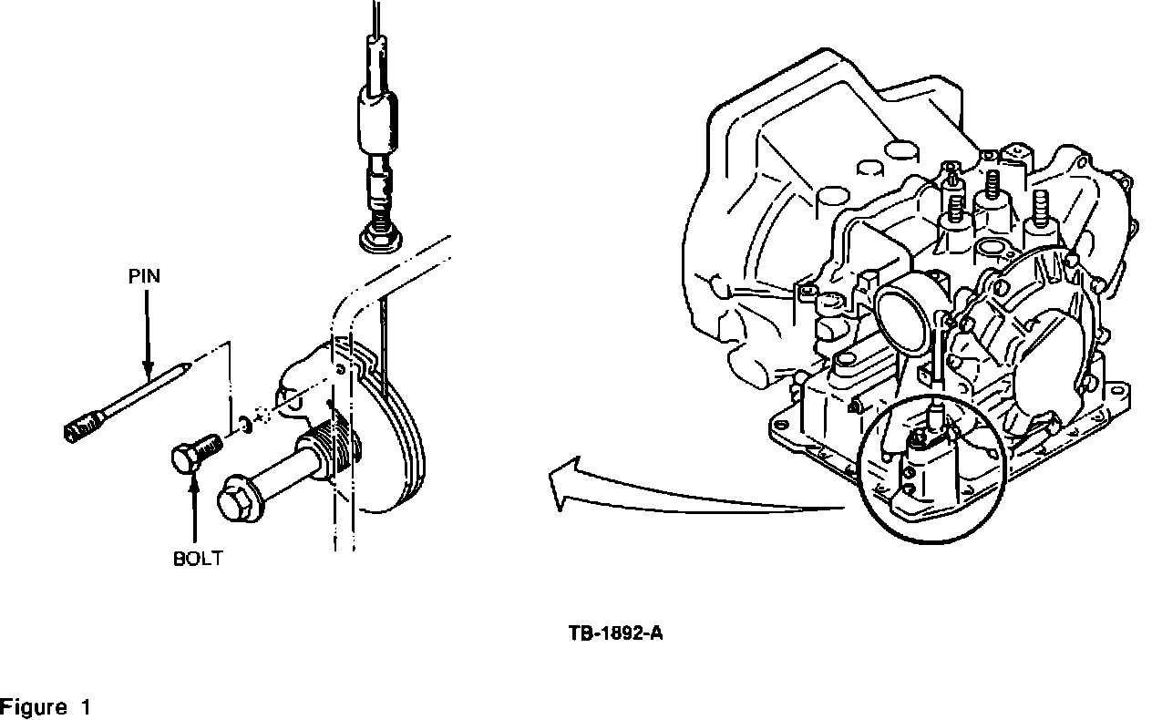 3. Remove the pin from the throttle cam, Figure 1. The pin is located just below where the TV cable enters the transaxle case.