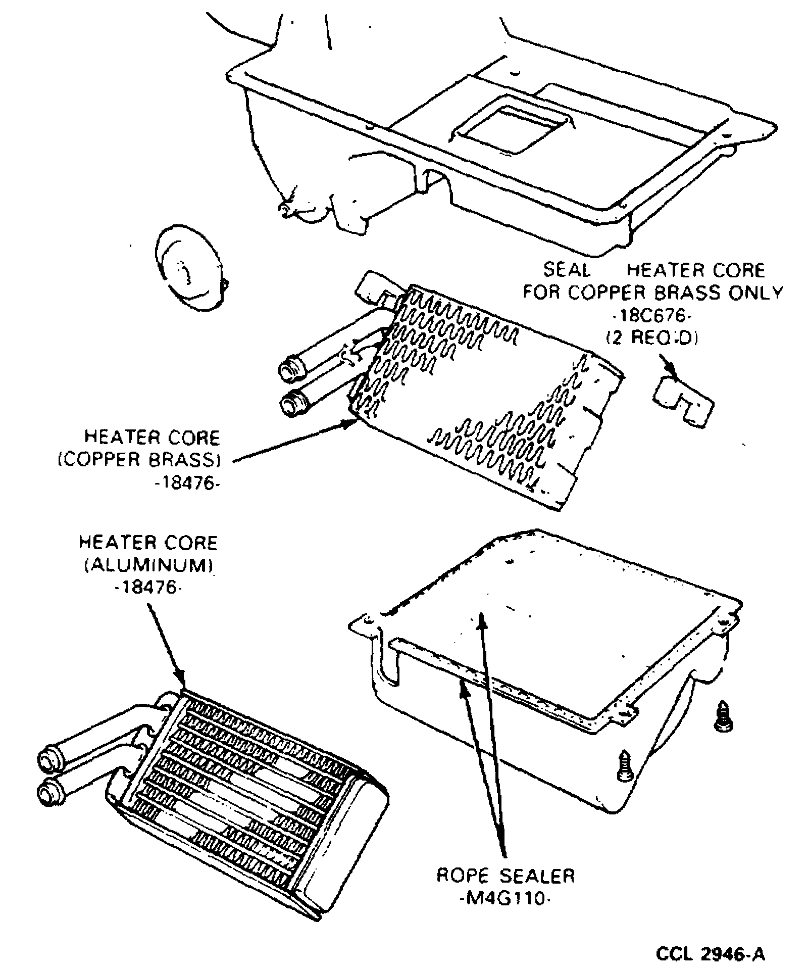 NOTE: Vehicles may be equipped with an aluminum or a copper brass heater core. In all cases, replacement cores are copper brass. It is essential to positively identify the type of core being replaced because aluminum cores use different heater core-to-heater case seals (Fig.19) than the copper brass cores. Having the correct seal is essential for satisfactory performance of the heater system.