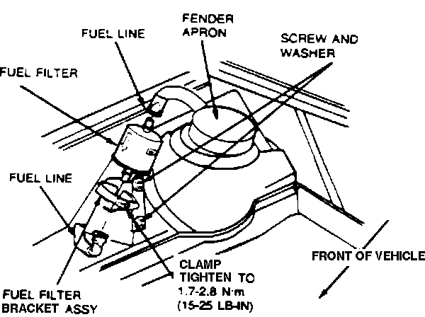 The fuel filter is located in the engine compartment in front of the RH shock tower.