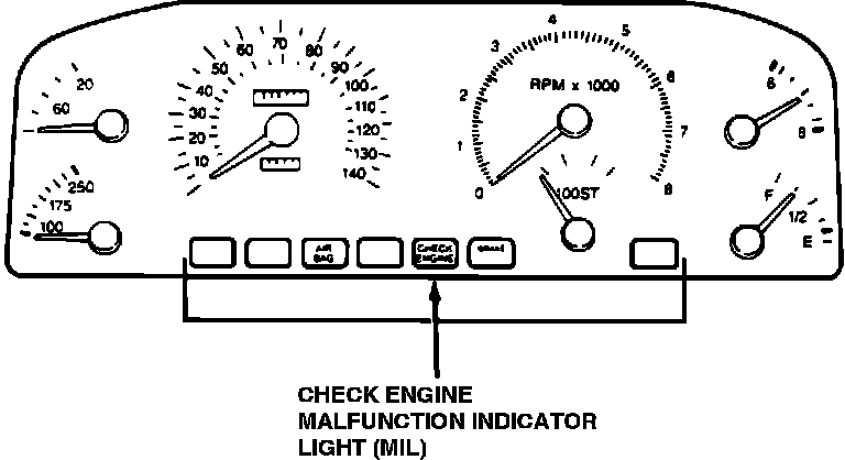The Malfunction Indicator Light (MIL) is mounted in the instrument cluster. The light will illuminate when the system has detected a fault and is operating in Limited Operating Strategy (LOS). It will stay ON as long as there is a fault is present. MIL can also be used to retrieve fault codes when the self test mode is entered.