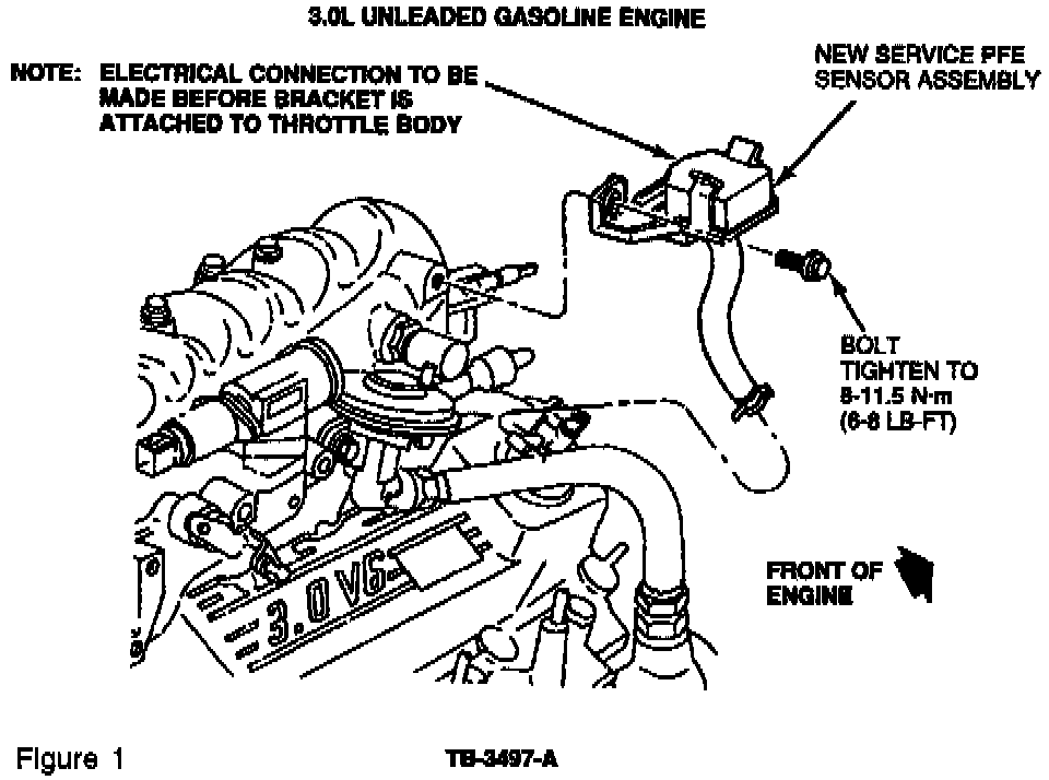 THE LARGE PORT SERVICE PARTS USED IN THE FOLLOWING PROCEDURES SHOULD ONLY BE USED ON THESE NOTED VEHICLES IN COLD CLIMATES WITH CONSISTENT MIL AND MEMORY-CODE-ONLY TYPE FAILURES - WHERE THE PFE SENSOR IS NOT A HARD FAILURE. THE PRE-EXISTING SMALL PORT SERVICE KIT IS RECOMMENDED WHERE THE SENSOR IS A HARD FAILURE. WATER IN THE SENSOR PORT IS NOT SUFFICIENT CAUSE FOR REPLACEMENT. WATER IS A NATURAL BY-PRODUCT OF COMBUSTION AND DOES NOT ADVERSELY AFFECT PERFORMANCE OF THE PFE SENSOR.