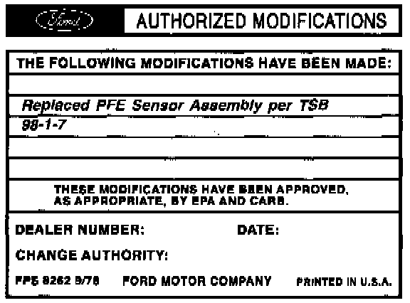 Obtain an Authorized Modification Decal (FPS 8262 - obtainable through DOES II, 25/pkg) and list the date, dealer number, and summary of modifications performed. Select a prominent place adjacent to the Vehicle Emission Control Information Decal suitable for installing the Authorized Modifications Decal. Clean the area, install the decal, and cover it with a clear plastic decal shield.