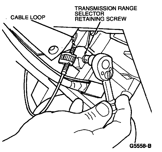 9. Install transmission shift cable and bracket loop on shift selector hook, and install transmission range selector cable bracket to steering actuator housing. Install retaining screw.