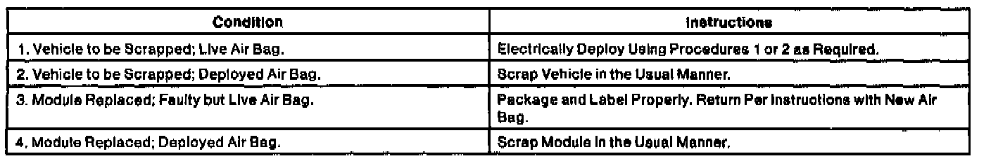 Several situations may arise which require some form of disposal action: scrapping a vehicle containing a deployed or live air bag, disposal of a live but electrically inoperative air bag module or scrapping a deployed module. Disposal recommendations are shown in the chart and discussed in detail below: