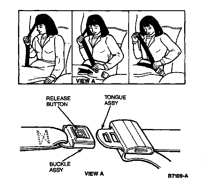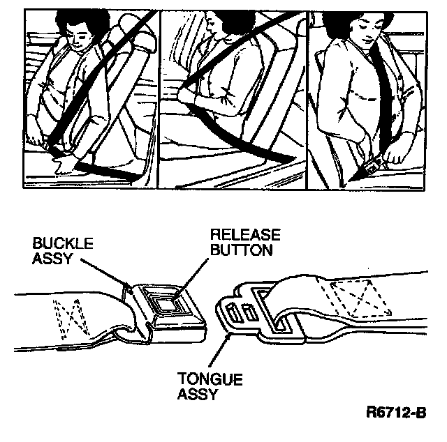 Pull the lap-shoulder safety belt from the retractor so that the shoulder portion of the belt crosses the shoulder and chest. Insert the belt tongue into the proper buckle until a snap is heard and a latch is felt.