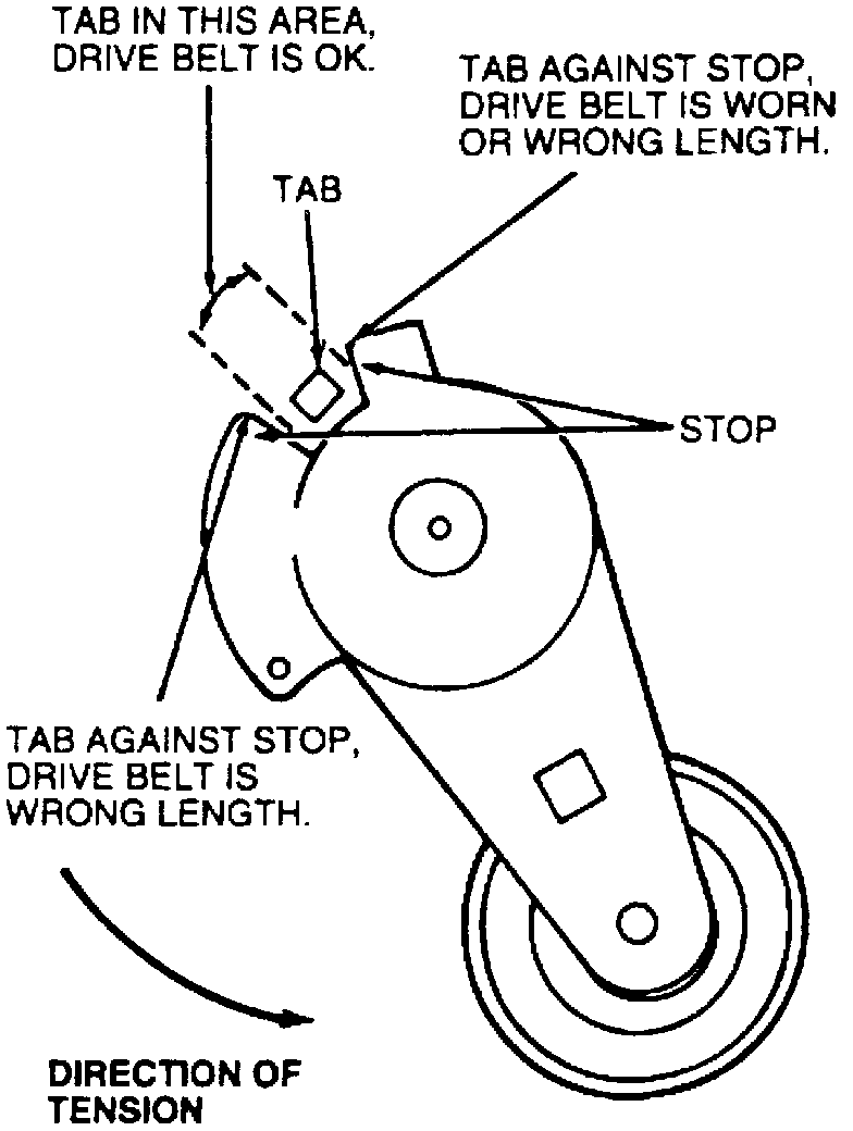 Drive belts have an automatic drive belt tensioner and do not require adjustment. The automatic belt tensioner is a spring loaded device which sets and maintains drive belt tension. Drive belt should not require tension adjustment for the life of the drive belt. The tensioner has a drive belt wear indicator mark. If the indicator mark is not approximately in the middle between tabs on the front cover, the belt is worn or an incorrect belt is installed.