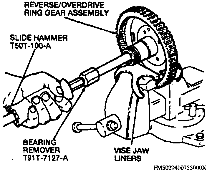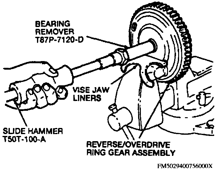 1. Use slide hammer tool No. T50T-100-A, input shaft bearing remover tool No. T91T-7127-A and bearing cup remover tool No. T87P-7120-D or equivalents to remove reverse/overdrive ring gear bearing assembly.