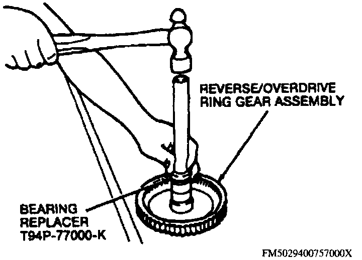 1. Position reverse/overdrive ring gear bearing assembly on bearing replacer tool No. T94P-77000-K or equivalent, then couple replacer tool with driver handle tool No. T80T-4000-W or equivalent.