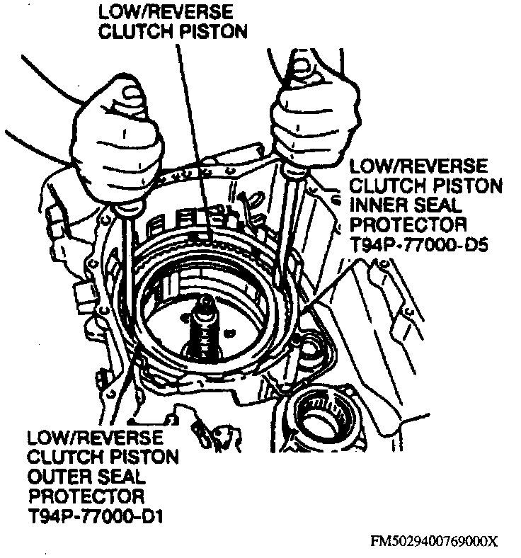 3. Install low/reverse clutch piston in outer seal protector tool No. T94P-77000-D1 and inner seal protector tool No. T94P-77000-D5 or equivalents, then install piston in case and remove tools.