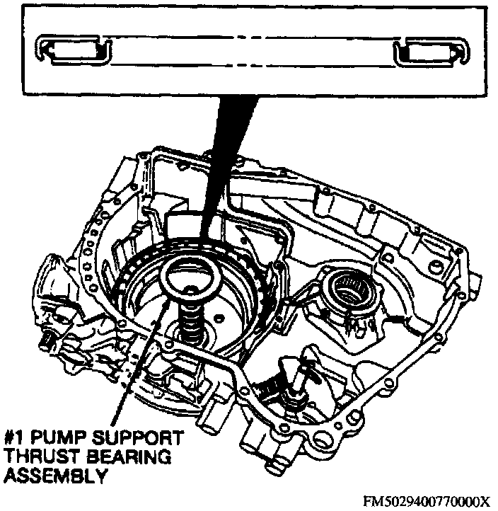 9. Install pump support thrust bearing as shown in the Pump Support Thrust Bearing Installation image, then remove seal sizer from forward/coast/direct clutch cylinder assembly.