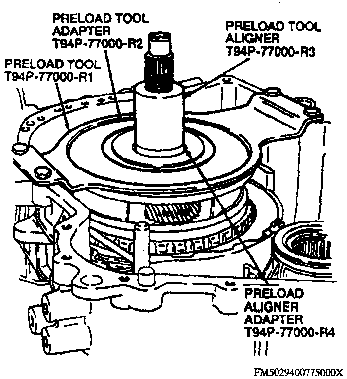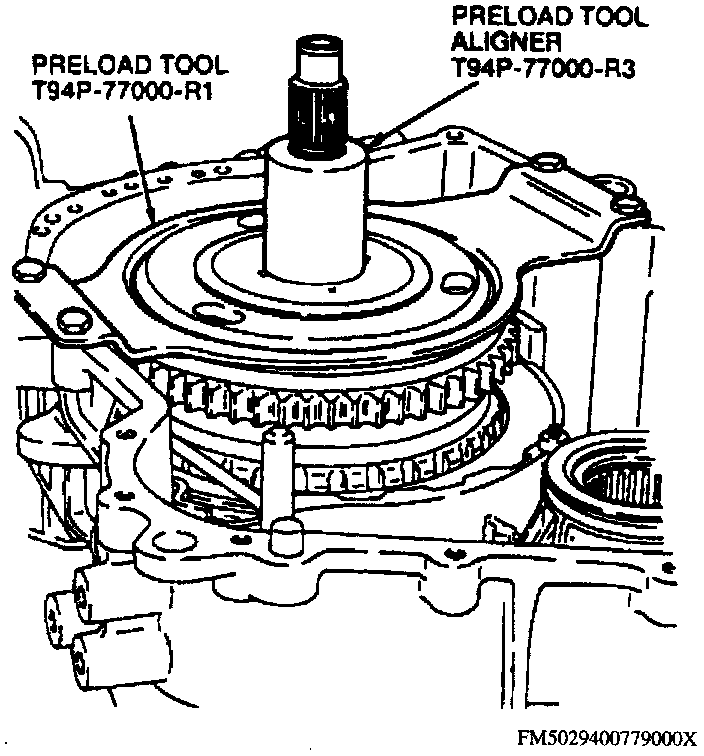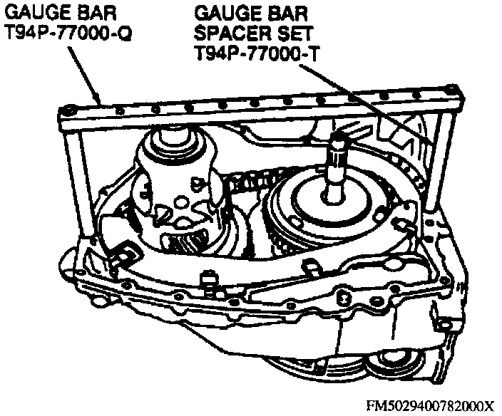a. Install gauge bar tool No. T94P-77000-Q and spacer set tool No. T94P-77000T or equivalents on transaxle case. Torque bolts to 10 ft lb.