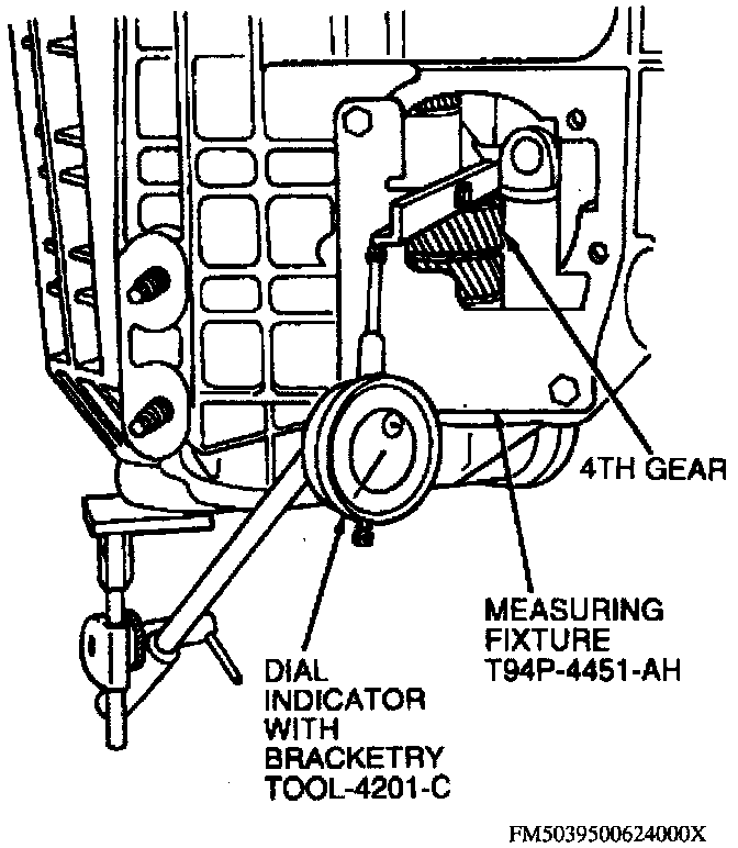 20. Install output shaft endplay measurement tools with dial indicator stem resting on measuring fixture and fixture against transaxle fourth gear as shown.