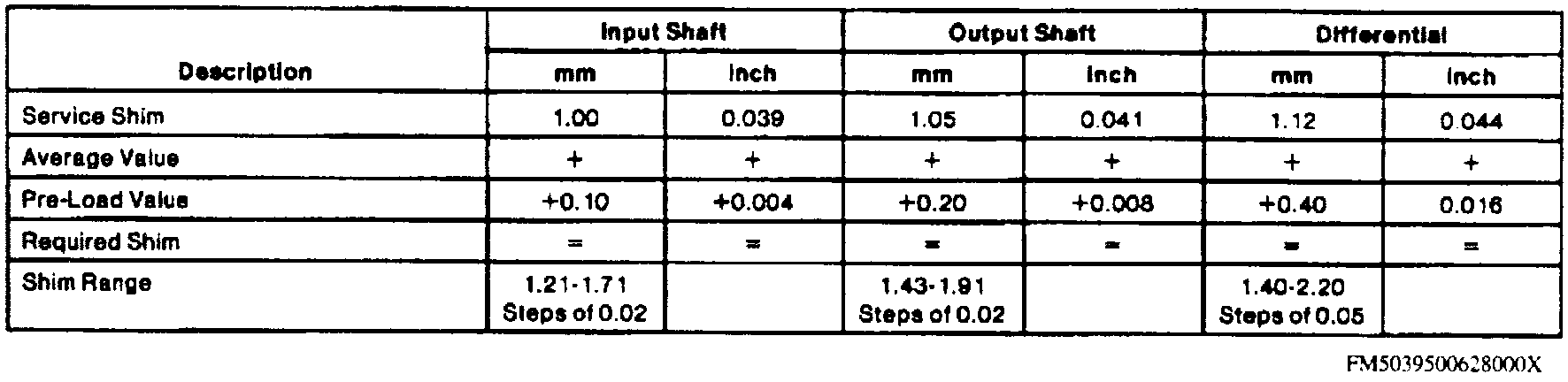 28. Use Preload Shim Selection Chart to calculate required shim thickness for input and output shafts and differential. Add total service shim thickness, average value measured in preceding steps and specified preload.
