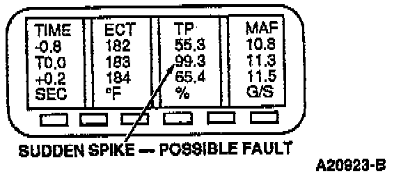 Look for abnormal behavior or values that are clearly incorrect. Inspect the signals for abrupt or unexpected changes. For example, during a steady cruise most of the sensor values should be relatively stable. Sensors such as TP, MAF and RPM that change abruptly when the vehicle is traveling at a constant speed are clues to a possible fault area.