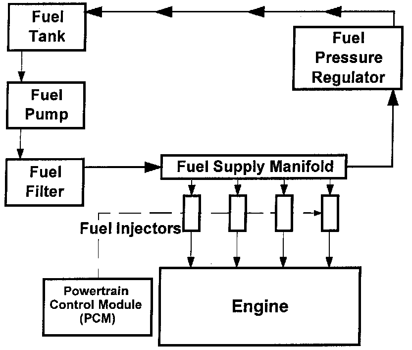 Fuel pressure across the injectors is maintained by a pressure regulator. Because fuel pressure is a constant while fuel demand is not, the system includes a fuel return line that allows excess fuel to flow through the regulator to the fuel tank.