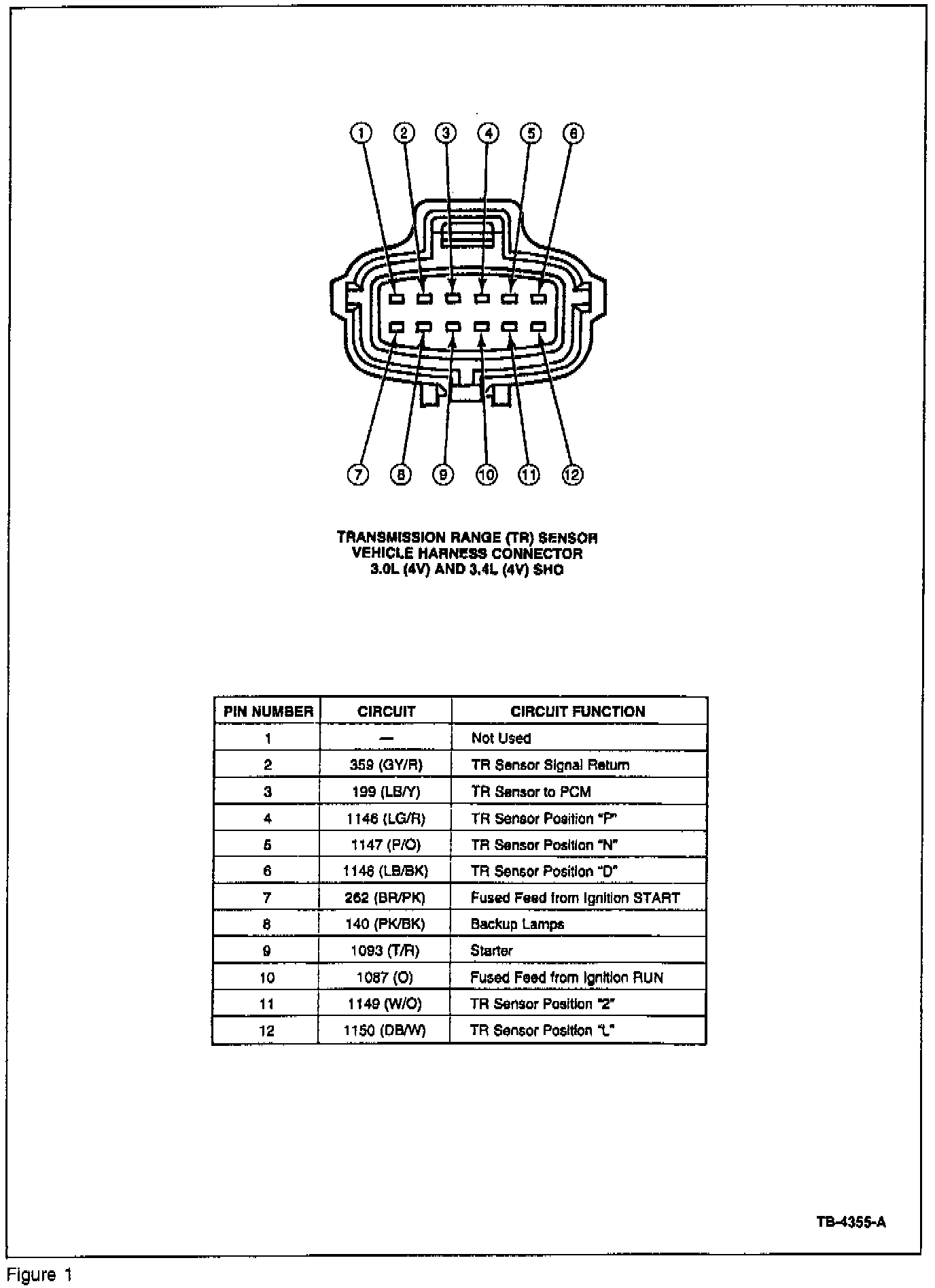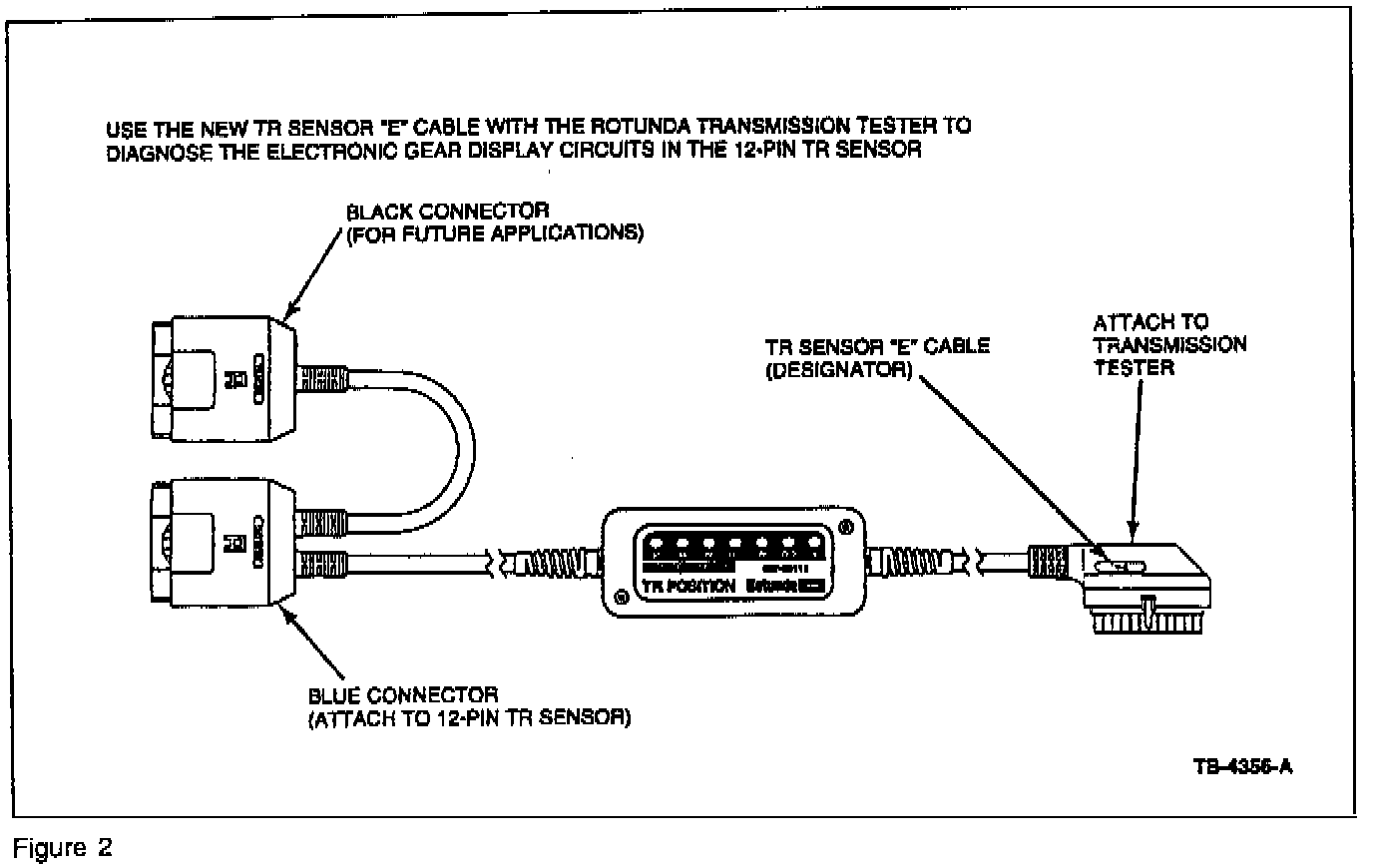 The Rotunda 1996 Transmission Range (TR) Sensor Tester Cable (007-00111) designated "TR-E" (cable indication is shown on cable end) was shipped to all dealerships in June/July. The new cable "E" is for testing on certain Taurus/Sable models equipped with an electronic instrument cluster and floor-mounted shifter. You must use this cable for correct diagnosis of the TR sensor.