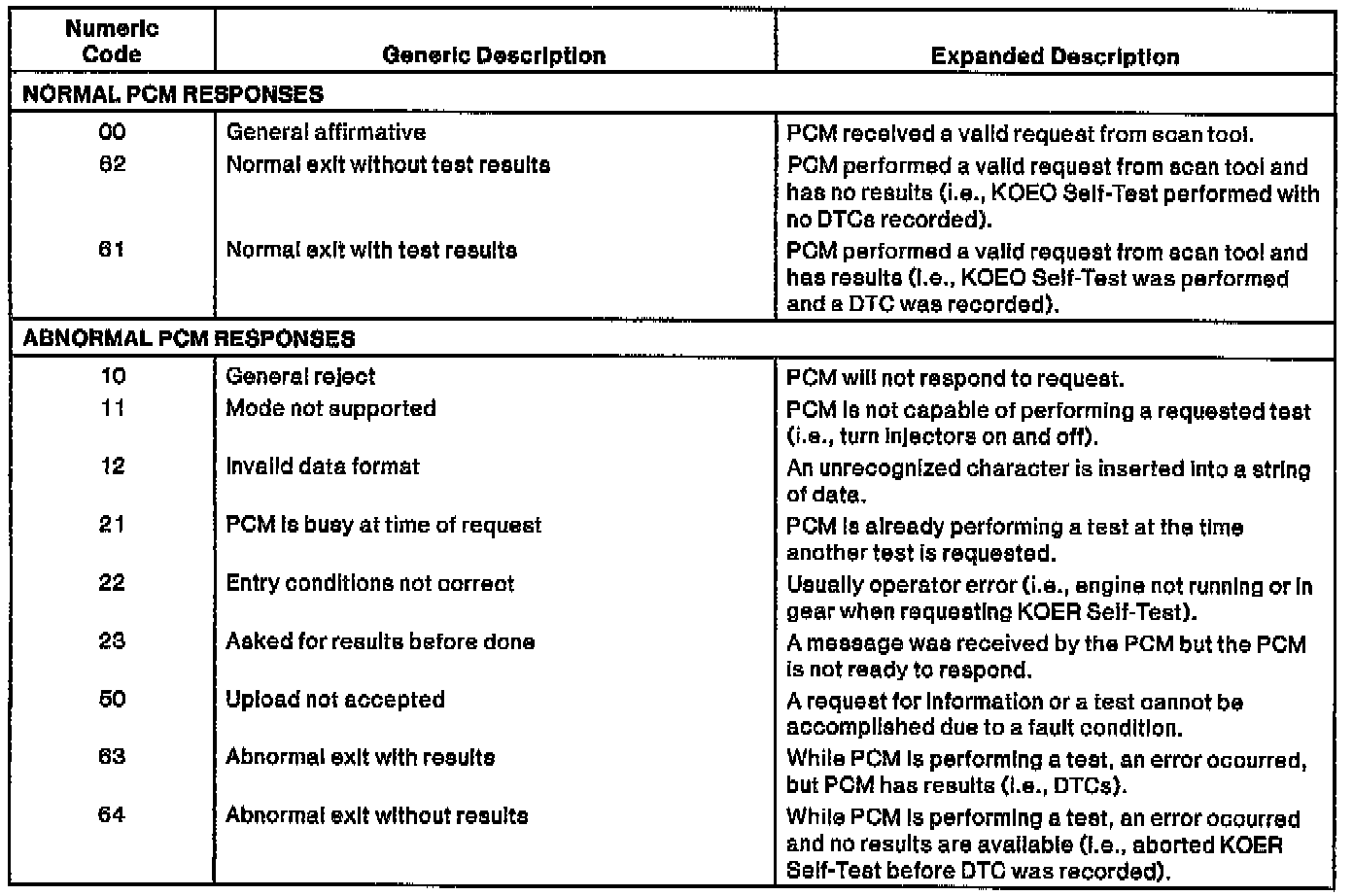 Listed are some of the numeric codes and generic descriptions that a scan tool may display when trying to perform some PCM operations. It is possible to get other numeric codes not listed. For a complete list of communication response codes, refer to Society of Automotive Engineers (SAE) document J219O enhanced E/E Diagnostic Test Modes. Some are normal responses to valid requests. The others are communication error responses. If, after checking scan tool connections, cable/adapters and entry of vehicle information, the tool displays any of the communication error responses, refer to Pinpoint Test Step QA1.