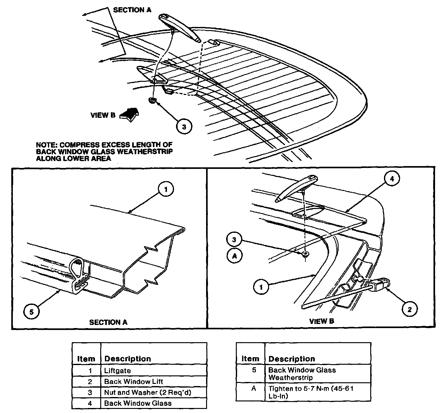 1. Remove liftgate upper and lower trim to gain access to nut and washer assemblies retaining back window hinges to liftgate.