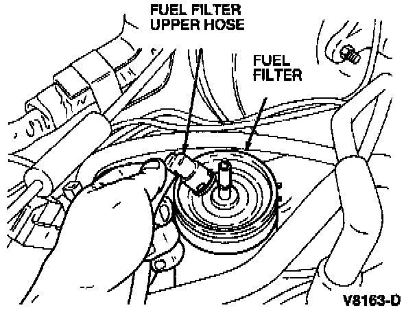 5. Disconnect the fuel filter upper hose from the fuel filter and drain any excess fuel into the container. Plug the fuel filter upper hose.