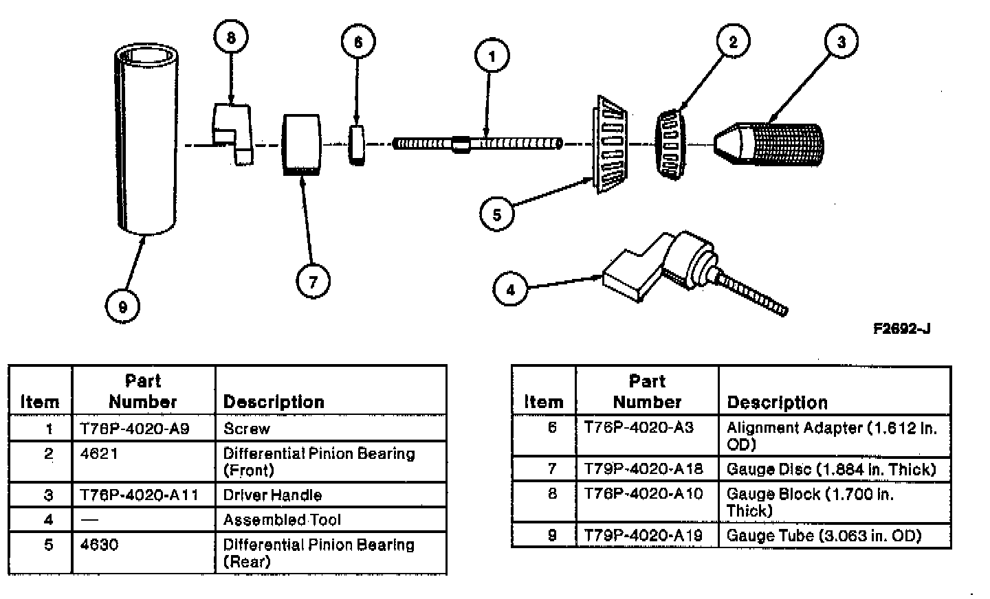 DESCRIPTIONA drive pinion bearing adjustment shim 0.254 mm to 0.965 mm (0.010 to 0.038 inch) is used between the rear differential pinion bearing and pinion head. The correct drive pinion bearing adjustment shim size will locate the pinion for proper tooth contact with ring gear. Selecting correct drive pinion bearing adjustment shim when installing a new differential ring gear and pinion can be done by using Pinion Depth Gauge Set T79P-4020-A.