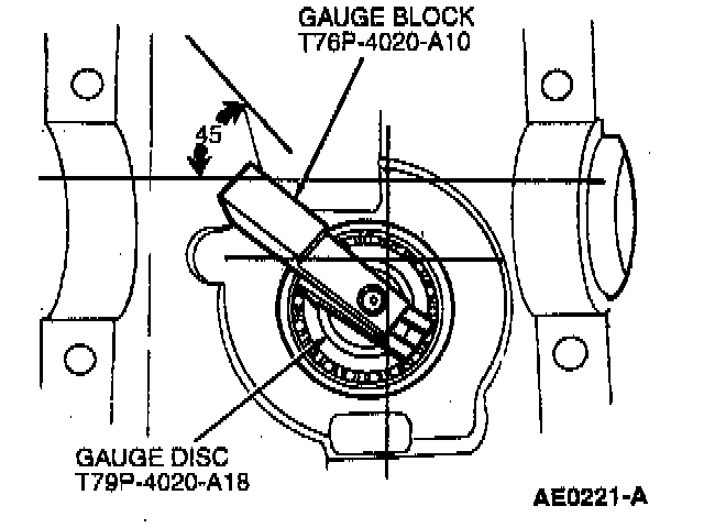 4. The gauge block should then be rotated several half-turns to make sure rollers are properly seated in bearing cups. Rotational torque on the gauge assembly should be 2.2 Nm (20 in. lbs.) with new bearings. Final position should be approximately 45° across gauge tube to make sure gauge block is in-line with gauge tube high point. This area should be used for pinion shim selection. Selection of drive pinion bearing adjustment shim with gauge block not lined up with tube high point will cause improper shim selection and may result in axle noise.