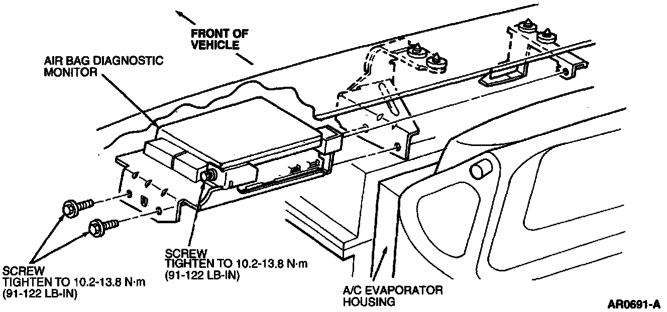 1. Install air bag diagnostic monitor on the air bag monitor bracket and tighten with three retaining screws to 10.2-13.8 Nm (91-122 lb in).