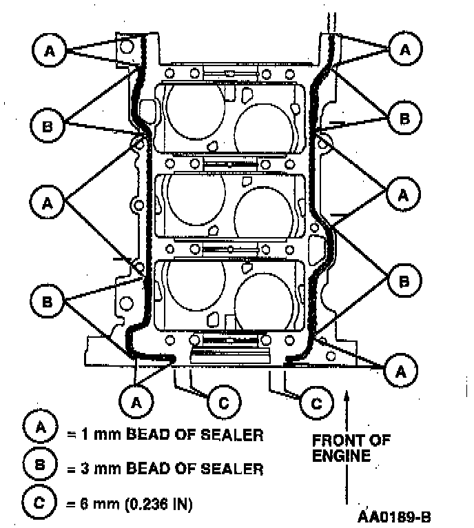 2. Apply a 1 mm (0.03937 inch) bead of Black Silicone Rubber F4AZ-19562-B or equivalent meeting Ford specification WSE-M4G323-A1 to lower cylinder block sealing surface of cylinder block and a 3 mm (0.118 inch) bead at grooves as illustrated.