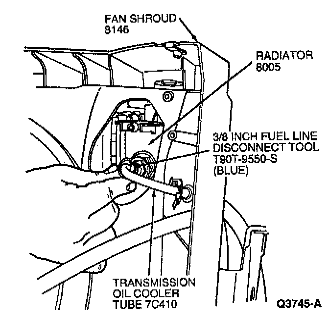 19. Remove transmission oil cooler tube using Fuel Line Disconnect Tool T9OT-9550-S.