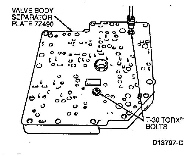 3. Place main control valve body on bench with valve body separator plate up, and remove two T-30 Torx bolts retaining valve body separator plate to main control valve body.