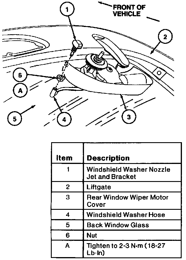 The rear window washer system:- Uses a single windshield washer nozzle jet and bracket mounted to the back window glass.