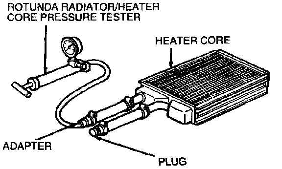 NOTE: Testing of returned heater cores revealed that a large percentage of heater cores were good and should not have been replaced. If a heater core leak is suspected, the heater core should be tested as outlined in the Plugged Heater Core procedures before pressure testing the heater core.