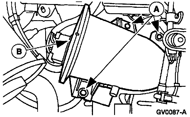 5. Remove the three (A) engine air cleaner bolts and remove the (B) LH half of the engine air cleaner.